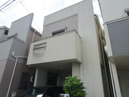 施工前は、外壁リシンの経年劣化による**細かいひび(クラック)**や汚れが目立っており、全体的に色あせた印象がありました。特にバルコニー下部には黒ずみ汚れがあり、美観の低下が見受けられました。